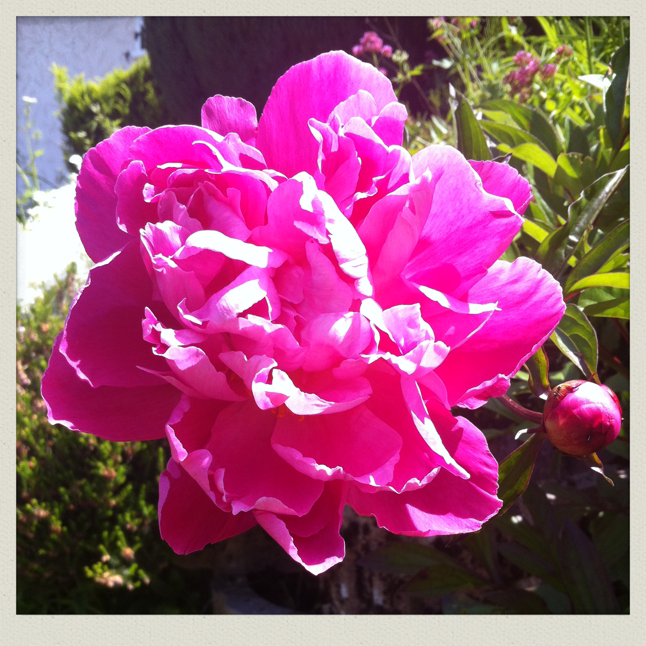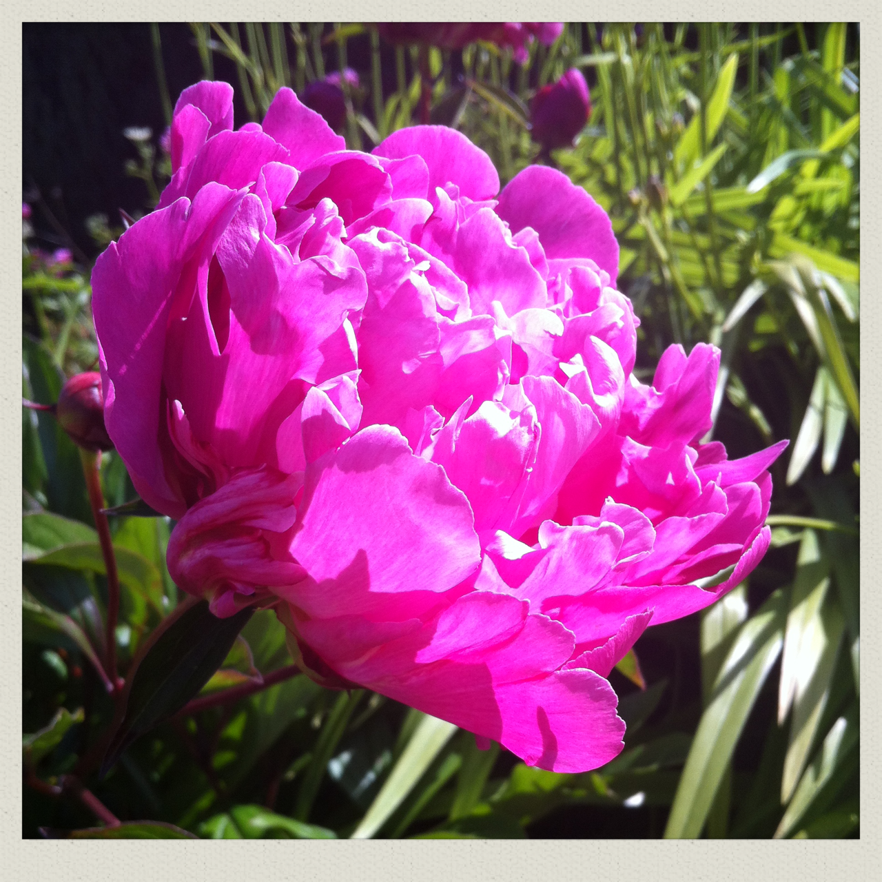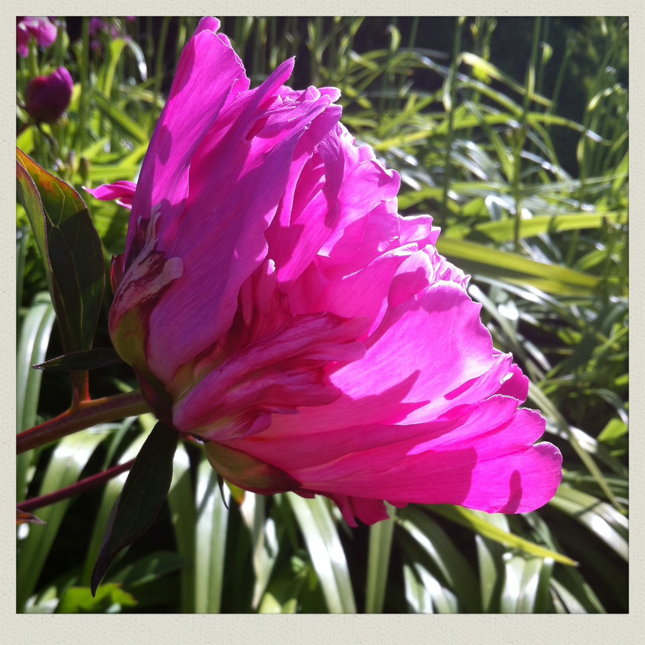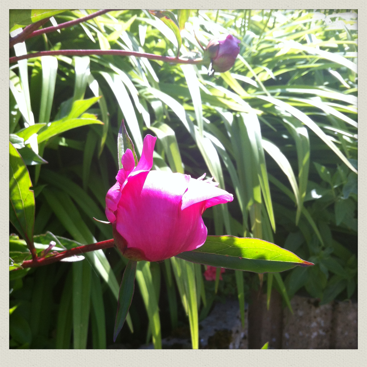 C'était jeudi. Flânerie dans le jardin. Brise légère et un peu fraîche, soleil capricieux. Elles étaient là. Deux immenses têtes rose fuchsia, toutes ébouriffées. Paeonia lactiflora ou pivoine de Chine. Splendides.