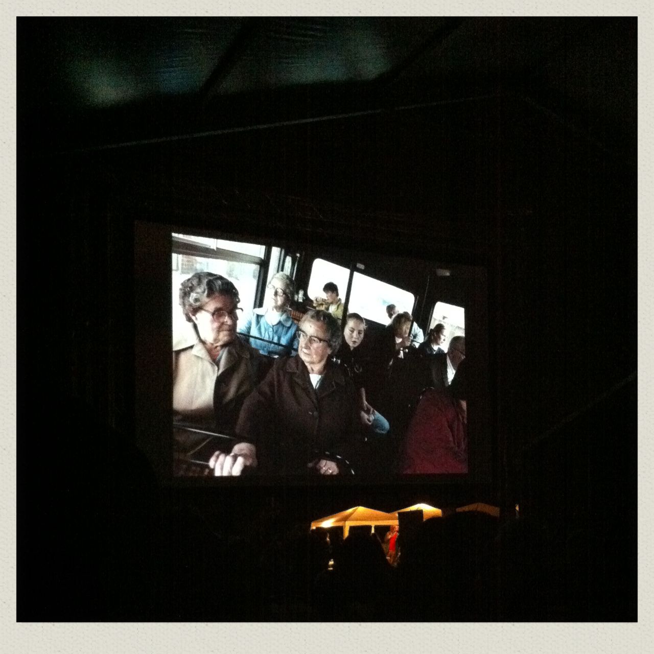 Sur le grand écran, nous avons assisté, entre autres, à la projection d'un vibrant hommage rendu à René Burri (en sa présence, donc). Quel talent et quelle incroyable carrière ! A une magique performance de l'artiste visuel Cédric Cassimo qui créa en direct des images avec une poignée de sable. Génial. A un fascinant voyage urbain dans les bus de Liverpool avec les images de Tom Wood.