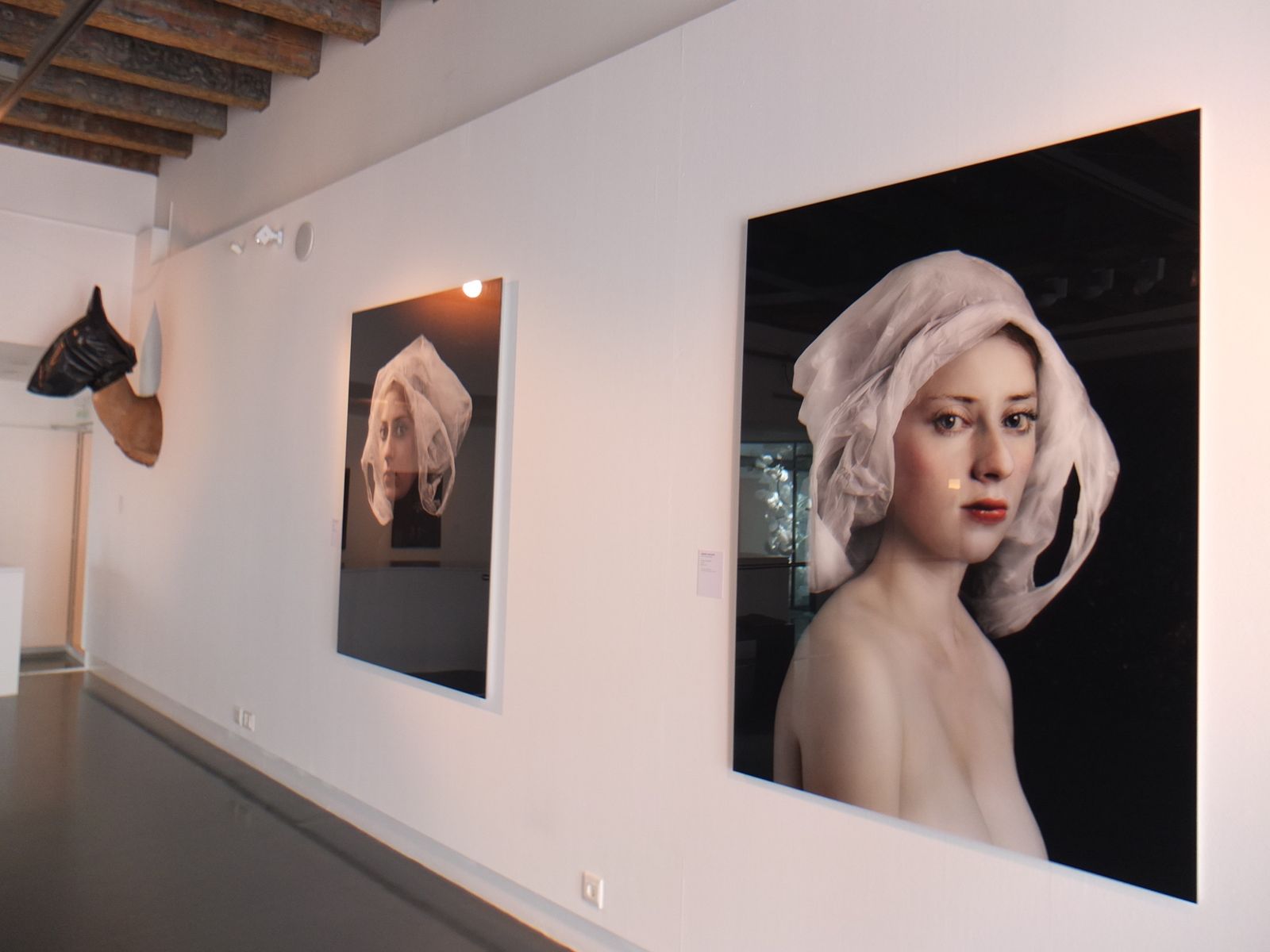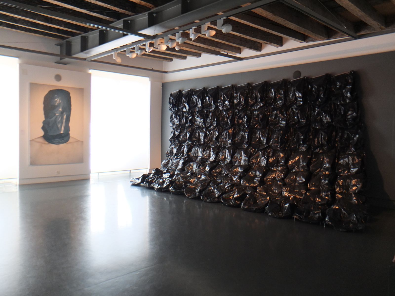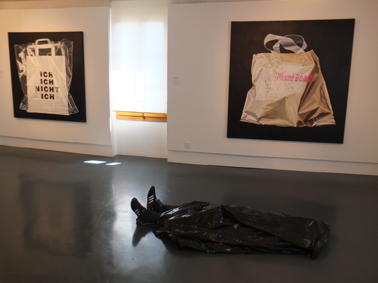 1ère photo : "Taxidermy, Trashbag" (tête d'animal empaillé, sac en plastique) de MyeongBeom Kim ; "Bag" (C-print) de Hendrik Kerstens, 2007. 2ème photo : "Handle with Care" (sérigraphie sur toile) de Lukas Julius Keijser, 2011 ; "Eighty-eight # 2" (installation, film plastique, bois, aluminium, sacs en plastique, composants électroniques) de Nils Völker, 2013. Les sacs se gonflaient à intervalles réguliers. Etonnant et fascinant, comme un grand coeur qui bat. 3ème photo : "Art Basel/Miami Beach" (huile sur toile) de Marie-Claire Baldenweg, 2012 ; "Mann (liegend, mit...") (silicone, sac plastique...) de Gregor Schneider, 2004. Là, je me suis faite avoir. Je regardais les toiles et j'ai heurté le corps en reculant... Quelle trouille ! J'ai vraiment cru qu'il y avait un macabé par terre...