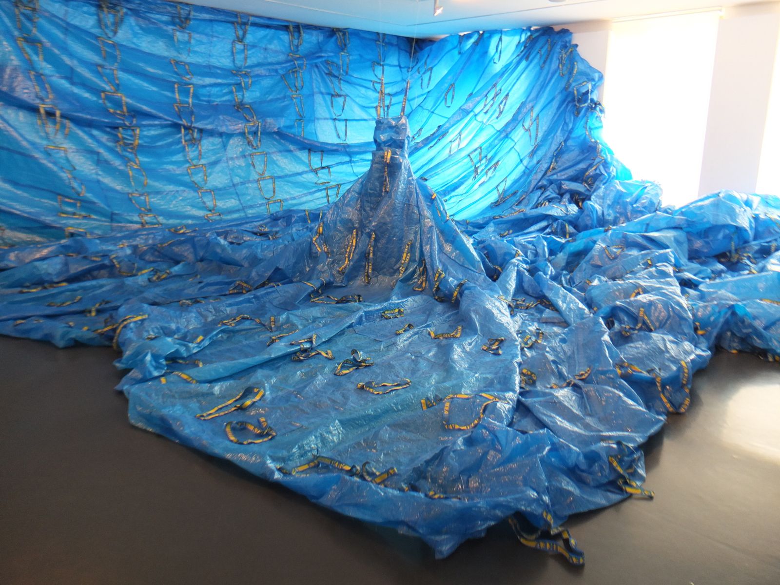 "ID(E)A", Ida-Marie Coell, 2007 (installation et performance, sac en plastique Ikéa, dimensions variables). Le saviez-vous, chaque sac est signé de la main de l'ouvrière ? On passe ainsi d'un produit de masse à un produit unique...